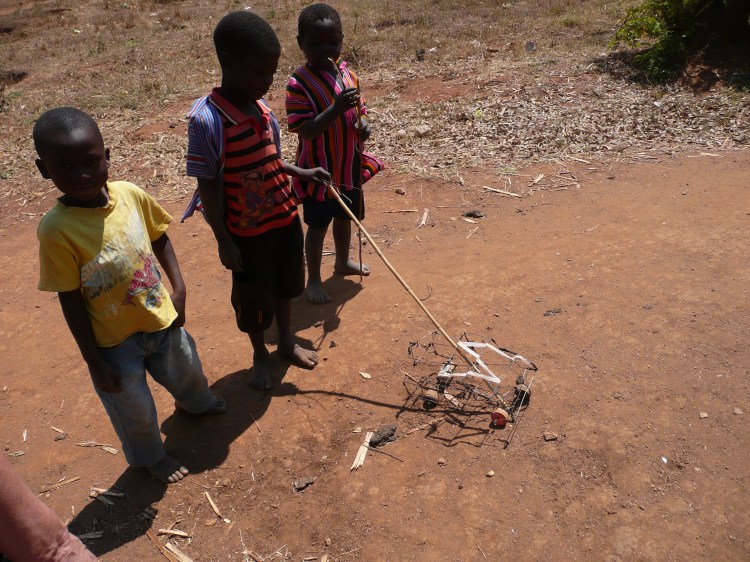Children make toy cars out of wire and scraps. And they love to play soccer!